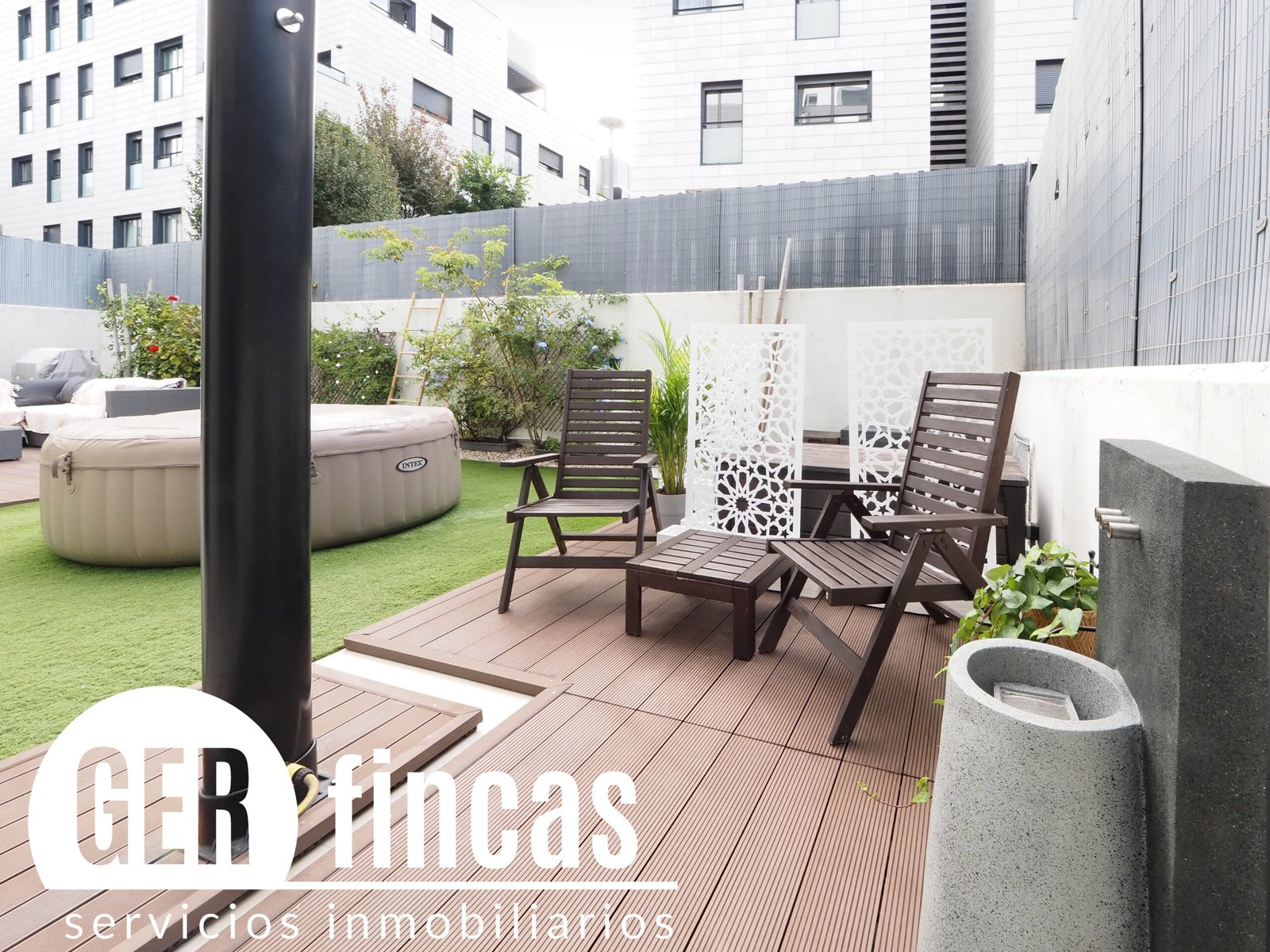 Jardín comunitario con dos piscinas de agua salada (adultos e infantil) y zona de solárium.