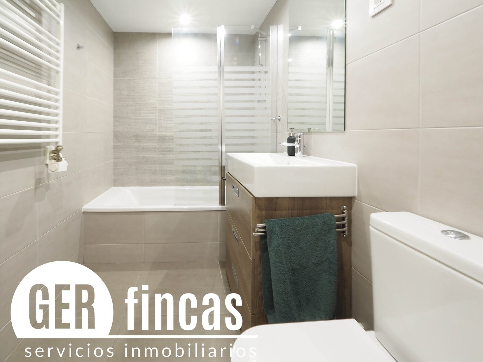 Con bañera, lavabo y sanitario, acabados premium.